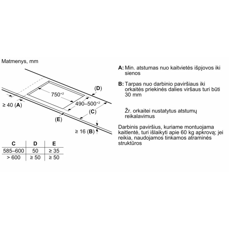 Įrengti reikalingas angos dydis (A x P x G mm): 51 x 750 x (490–500)