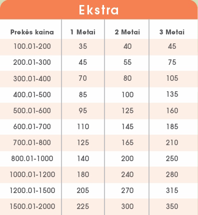 3) „Extra planas“ – suteikia Jums galimybę naudotis tomis pačiomis nemokamomis remonto paslaugomis kaip ir turintiems Įprastą planą. Šis planas skirtas norintiems įsigyti paslaugą praėjus 1 mėn. nuo prekės pirkimo, bet ne vėliau nei 3 mėn. iki gamintojo garantijos pabaigos (per 21 mėn. nuo prekės įsigijimo) (galioja tik fiziniams asmenims).