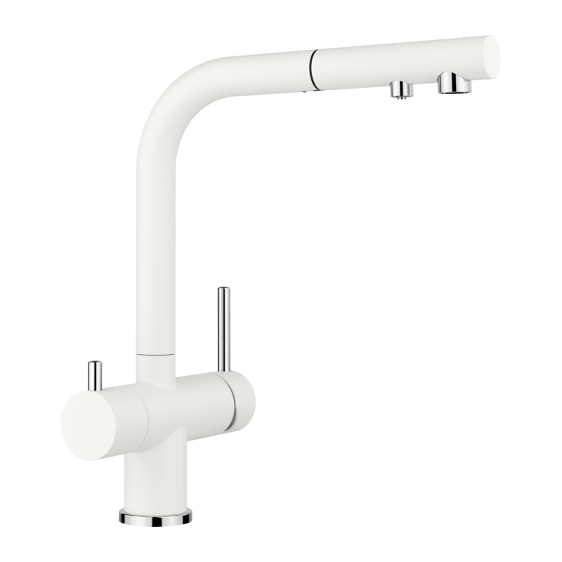 Atskiras vandens kontūras: šalto ir šilto vandens svirtis dešinėje, filtruoto vandens svirtis kairėje