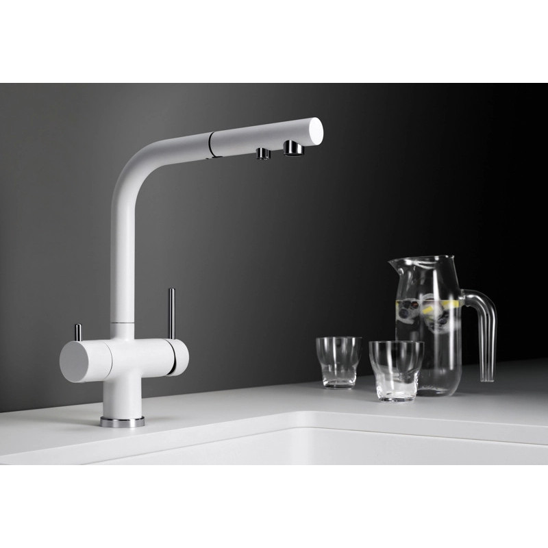 Patogus 3-1 maišytuvas su šalto ir šilto vandens svirtimi dešinėje ir filtruoto vandens svirtimi kairėje